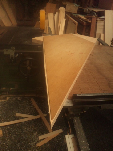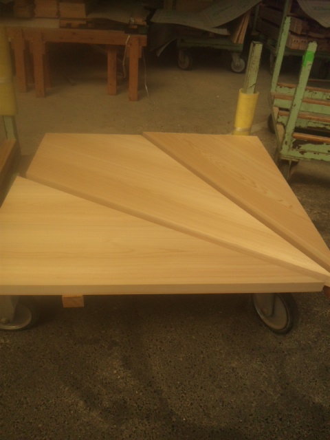 次の日に、ハタガネを外し、45度と30度の定規を使ってカットすると、2段回りと3段回りの階段の段板が出来ます。(写真は桧材です)
