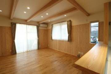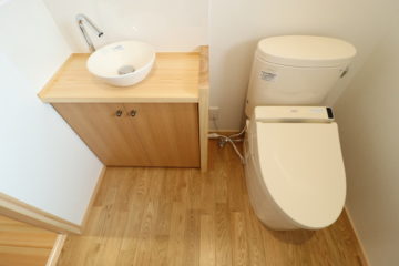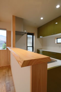 天然桧のキッチンカウンターと、トイレ手洗いカウンター