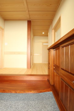 お手持ちだった下駄箱を造り付けにして、大黒柱共、同色仕上げに。