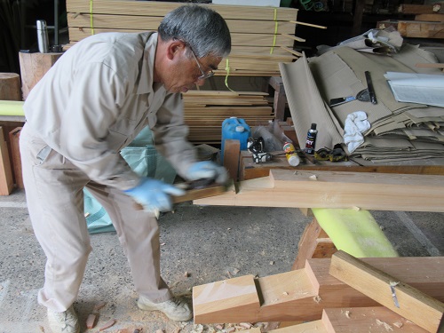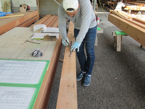 墨付けをして継手(つぎて)や仕口(しぐち)の加工をしています。