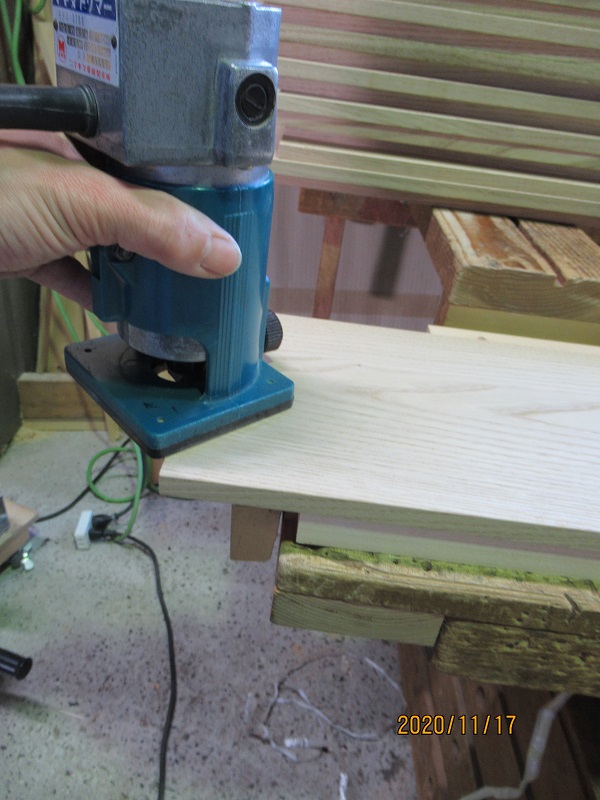 加工場では、仕上げ寸法に加工して、次に表裏の上下左右ぐるりの角をトリマーという機械で少し落とし、触っても痛くないよう加工しました。