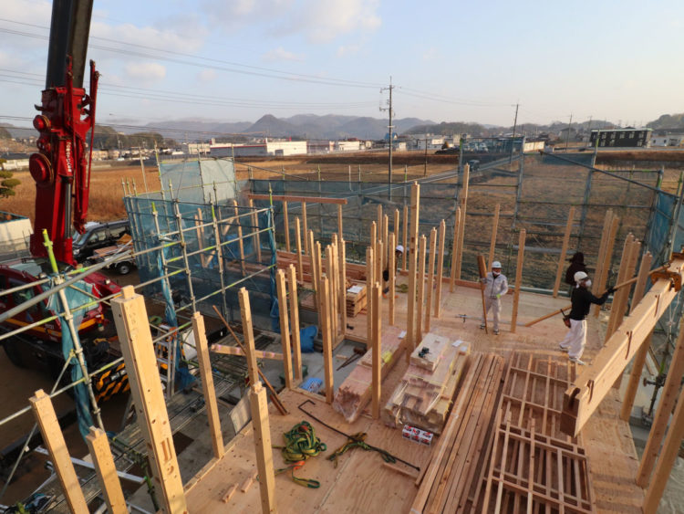 ~精度を確認しながら、梁、桁を組み上げ~