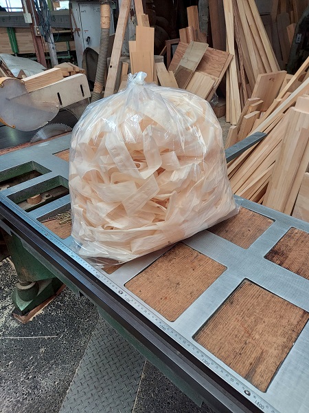 巾木を仕上げた時に出たカンナくず(桧、幅4cm)を45㍑の袋に、こんもり2袋用意してみました。