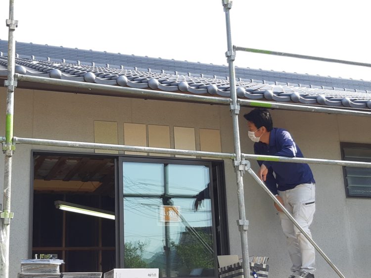 監督さんが候補のサンプルを外壁にあてて準備を。