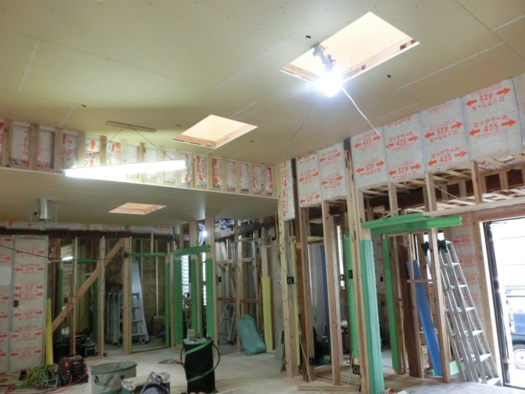 断熱材が入り天井の形が出来て、梁と柱の骨組みだけになっていた2ヶ月前とは随分変わりました。