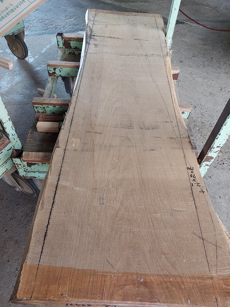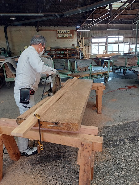 いつもは、リッパーと言う機械で切断するのですが、厚く、硬い木材なので、大丸のこで切断しました。