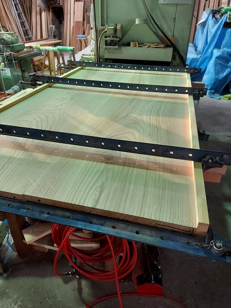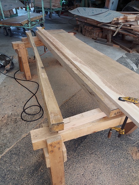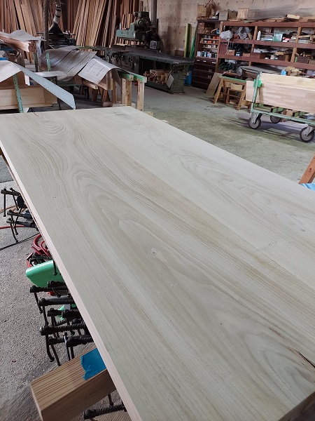 その後、カンナ盤で幅、厚さを加工し、表面を仕上げてから集成ボンドで、2枚を張り合わせます。