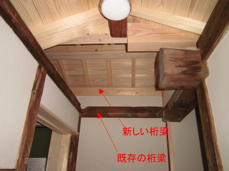 新しい方は白いね、くらいの違いですが、この新しい桁とタル木は屋根の一番上の棟までつながっています。