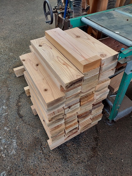 今、加工場に杉の45×105(4.5㎝×10.5㎝)、長さ40㎝位~50㎝位の端材が60個位出来ました。
