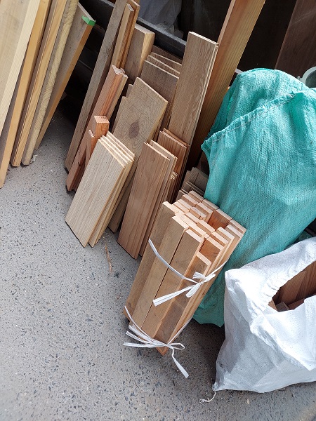 加工場では、現場から帰ったもの(切った残り)、加工場で出た端材を多少ですが、ストックしています。
