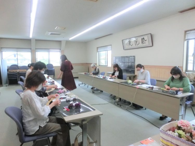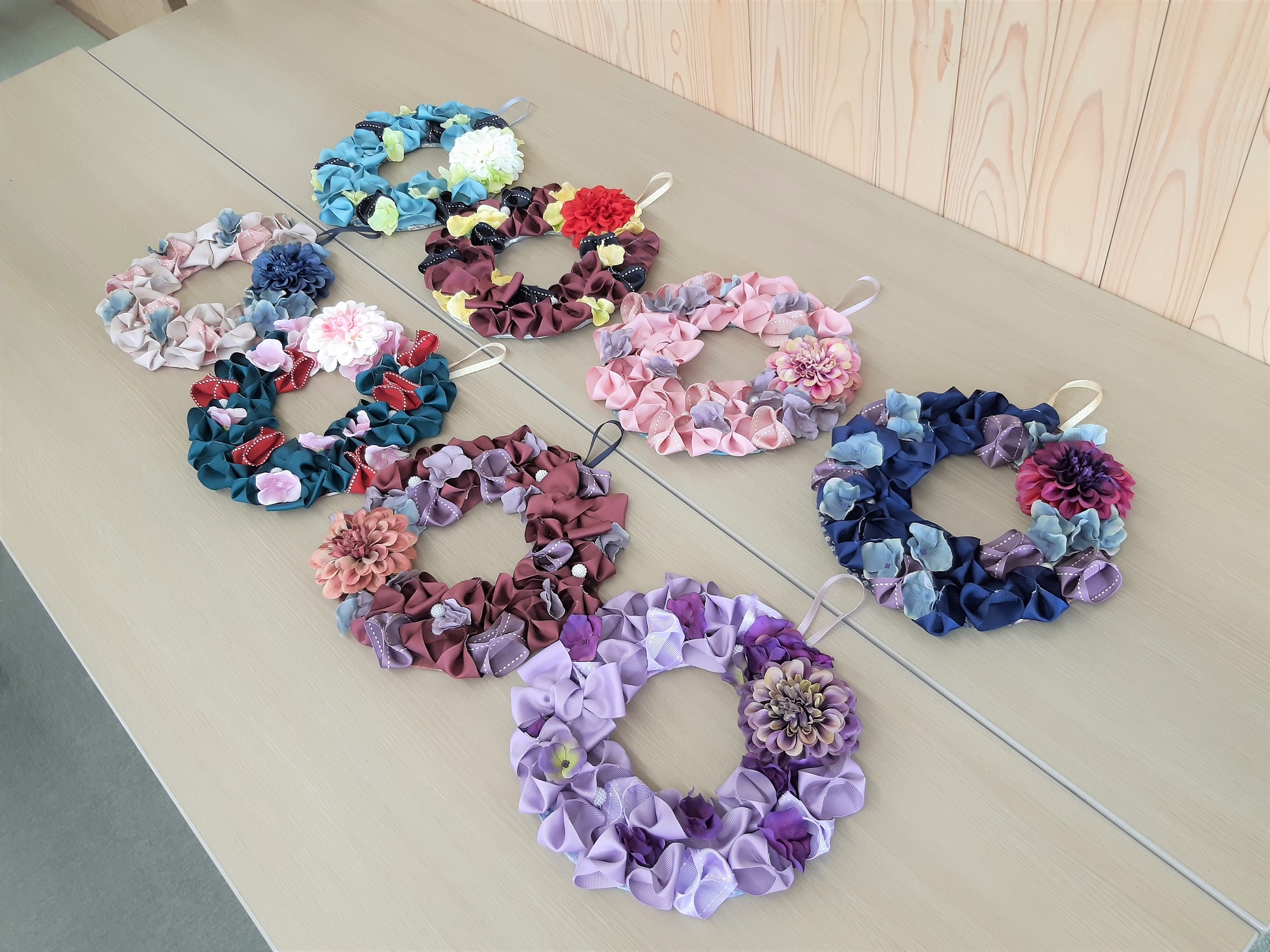 リボンと花を同系色でまとめたり、ワンポイントで目立たせたり・・・と、組み合わせによって一つ一つ雰囲気が異なり、皆さんのセンスが光る素敵なリボンリースができました。