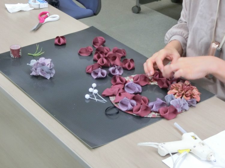 たくさんの色のリボンから、お気に入りの組み合わせを選んでいただき、針や糸を使わずに両面テープでリボンの形を作っていきます。全部で大小23個のリボンを皆さん集中して黙々と作業を。