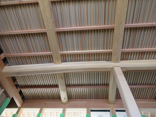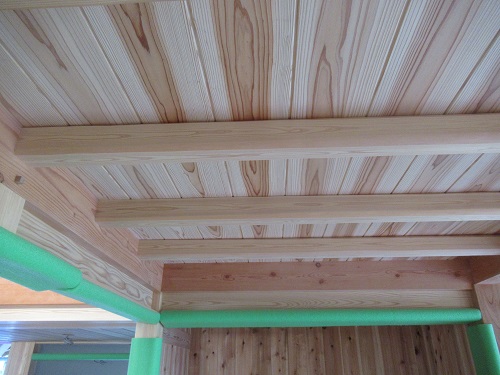 こちらは杉の面皮(めんかわ)と言って丸太の角だけ丸みを残したものです。この上に杉の浮造り(うずくり)仕上げの板を貼っています。