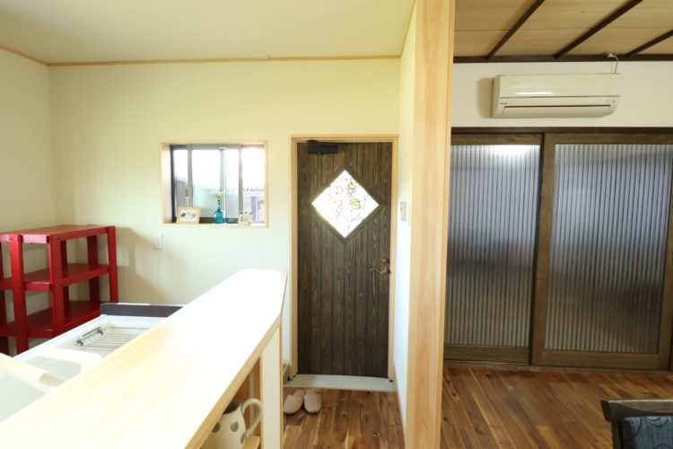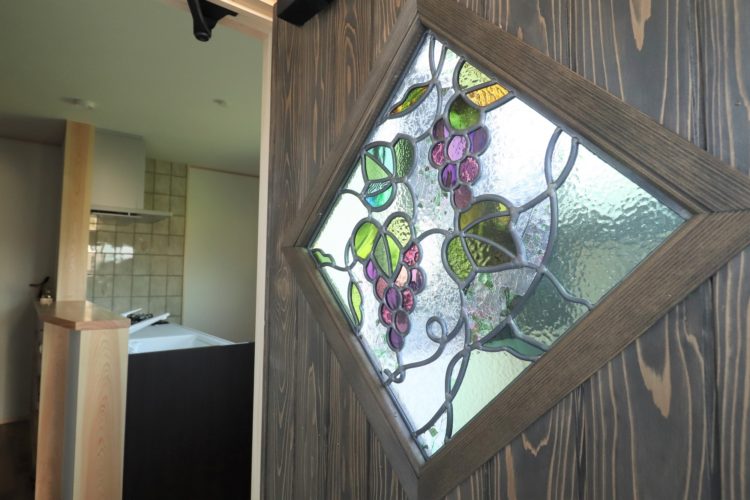 勝手口は杉の木製ドアにやり替えて、お客様が取り寄せられたステンドグラスをはめ込みました。