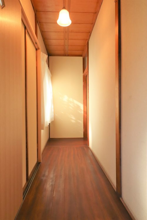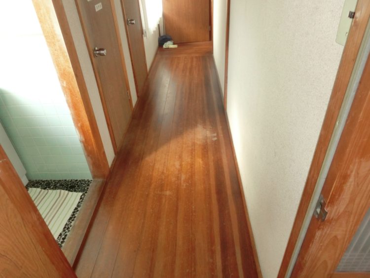 長年に渡って使われてきた廊下は、床材はそのままに研磨をしてから塗装をし直して蘇りました。