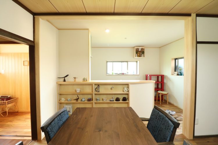 奥様が持たれていたカップや木の置物などを飾れる棚を設けて、ダイニングからの眺めも素敵です。