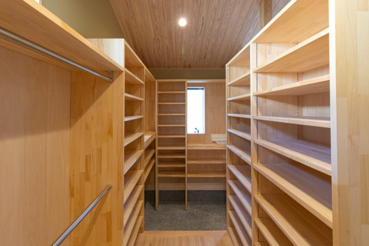 納戸・パントリーの両面壁に奥行の違うオープン棚を。