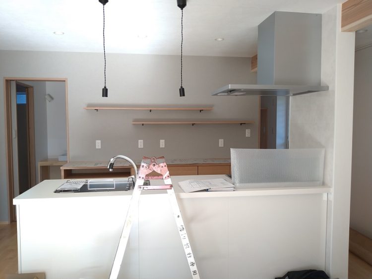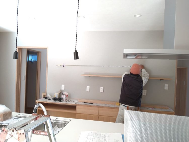 システムキッチンの背面に造り付けしたカウンター収納上の壁に棚を2段、