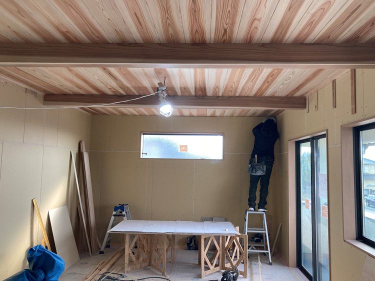 明るいリビングと木目のきれいな杉の天井が心地よく、家族が集う素敵なリビング空間になりそうです。