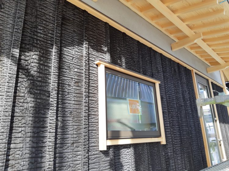 この日は大工さんが外部に焼き板を一枚一枚カットして取り付けていました。