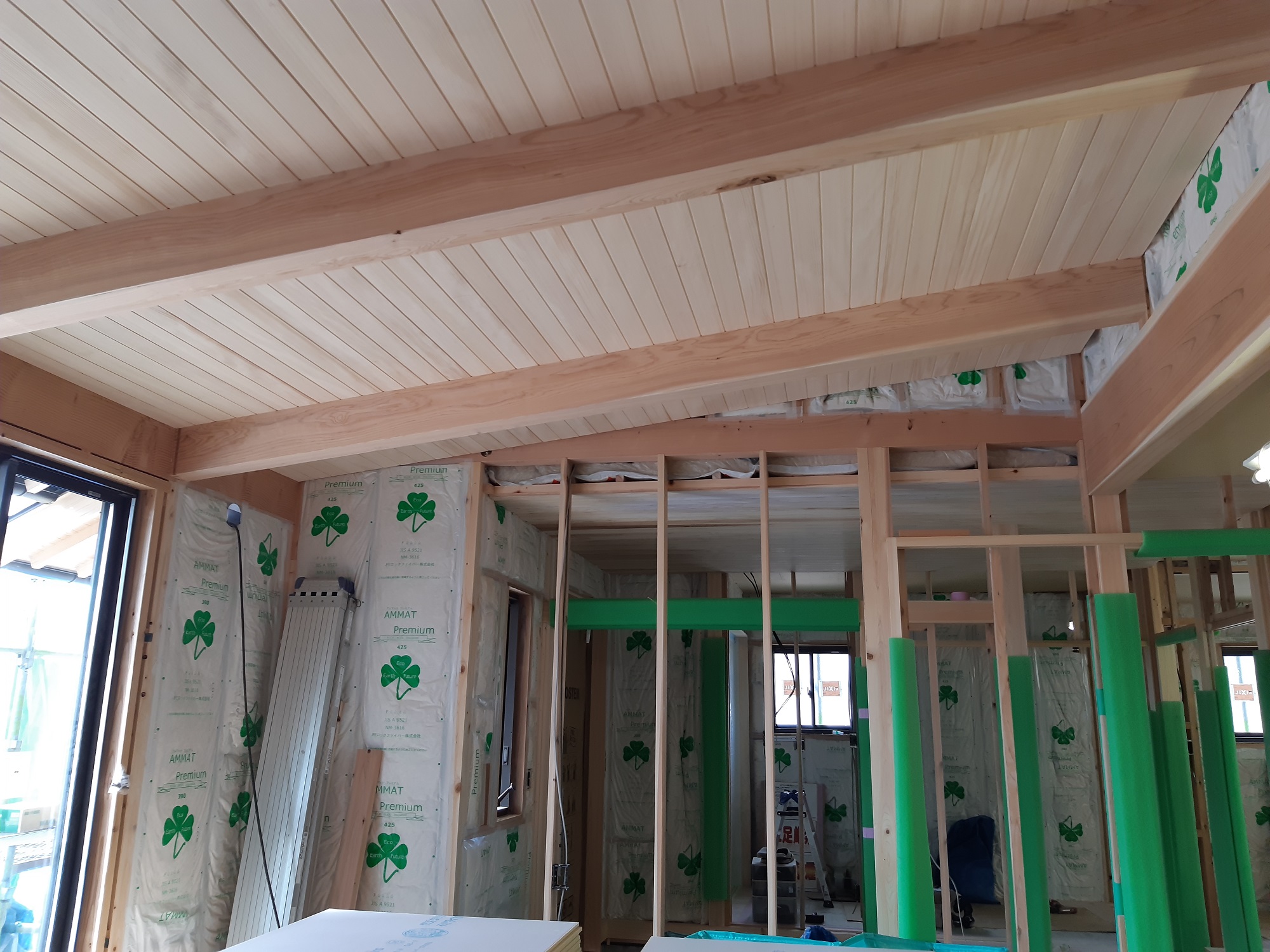 ソファに座って見上げるとモミの板貼りの温もりが感じられ、これから暮らしながらゆっくりと時間を掛けて木の色合いの変化も楽しめて、とても心地よいリビング空間になりそうです。