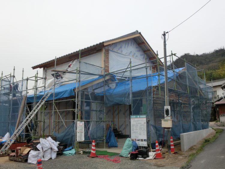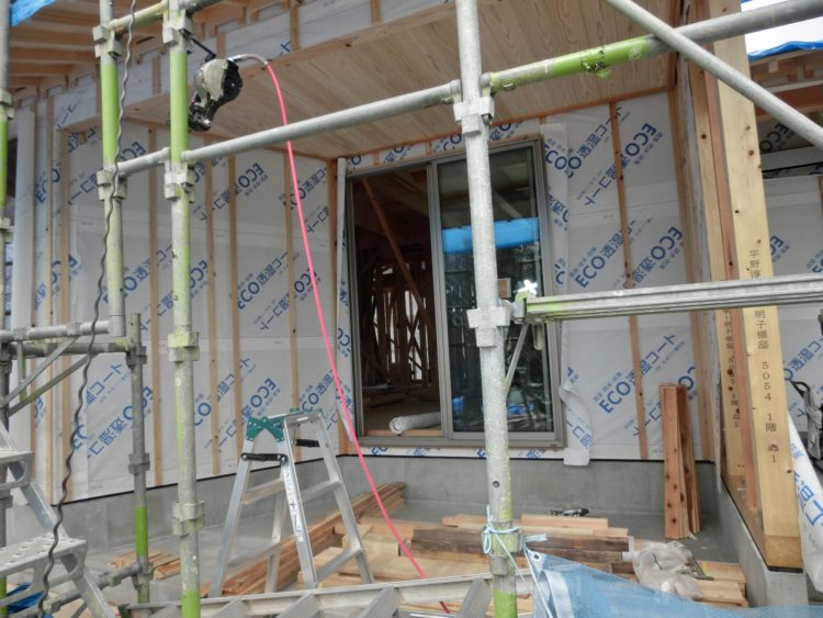 少し前に上棟をしたこちらの現場では、大工さんが造作工事、瓦屋さんが瓦を葺いていました。