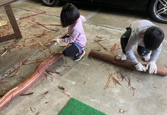 ちょっとお手伝いをお願いしてみたところ、丸太の皮むきを手伝ってくれました。