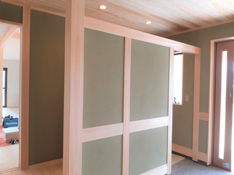 反対の壁にはピクチャーレールをつけて、じゅらくで塗られた壁にお客様が足を運んで見つけて来られた素敵な作品が飾られる予定です。