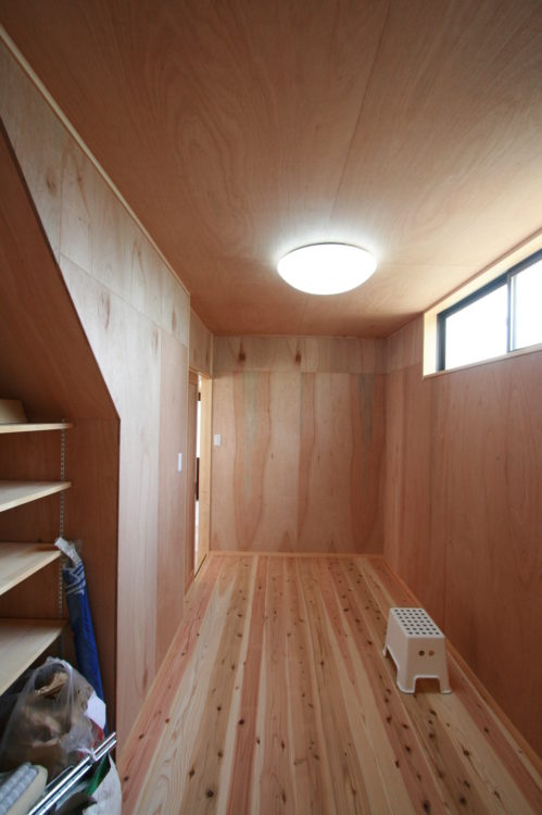 納戸として計画した一部に、オープン棚を設置して、利用。