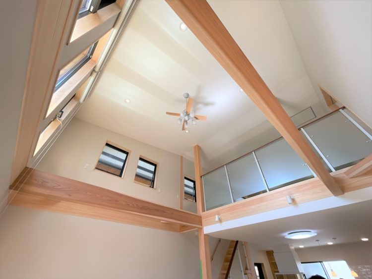 吹抜けの窓は電動で開閉できるようになっていて、光と風の両方を取り込み、シーリングファンで心地よく空気を動かしてくれます。