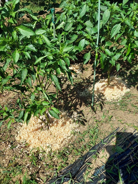 苗を植えた後に、根元回りにおがくずを撒いておくと、下の葉が雨や水やり時に土跳ねがしにくくなったり、夏の水やり後の土が乾きにくい利点があります。