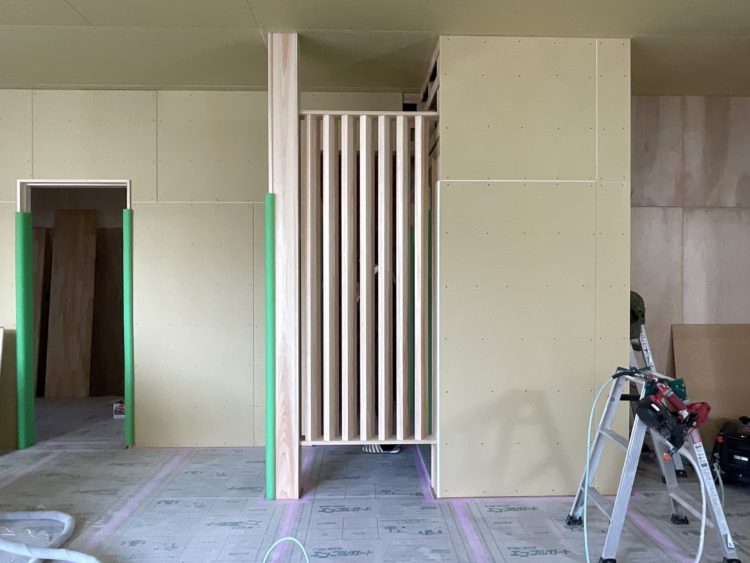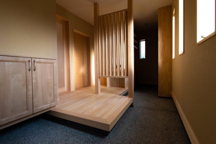 玄関から入った時の正面に立てて、空間を区切らないようにしながらその奥にあるトイレや手洗いスペースが直接見えにくいように工夫しています。