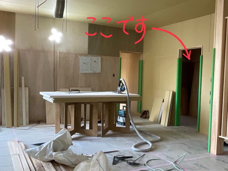 大工さんの作業台が置いてある辺りにアイランドのキッチンがドーンと据わります。
