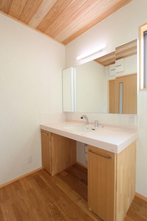地袋収納の扉にはタオル掛けを取り付けて、規格品の組み合わせで大型三面鏡も。