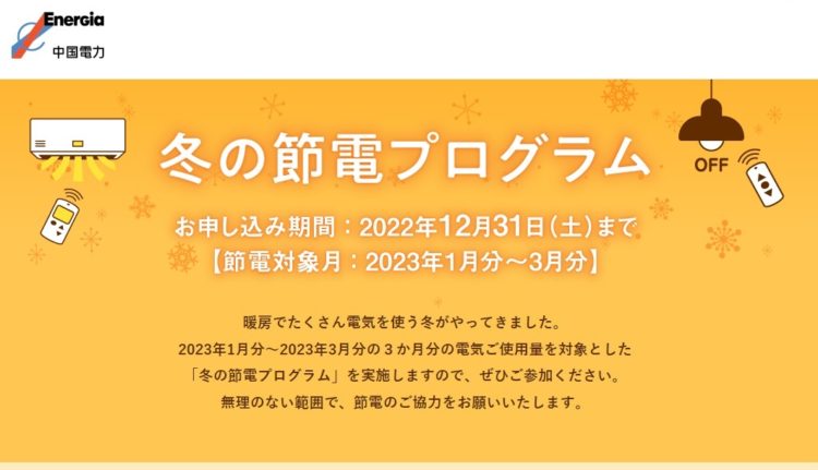 今、中国電力さんの「冬の節電プログラム」に参加すると、