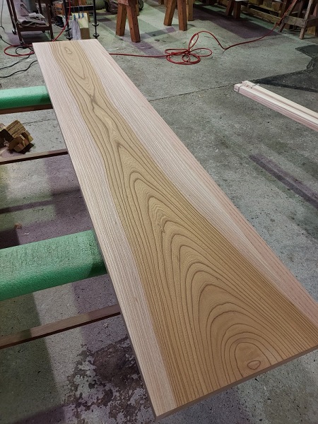 今回、写真の木材は、ケヤキ材で30年位倉庫で乾燥させていたものをK様邸の下駄箱の天板に使用しました。