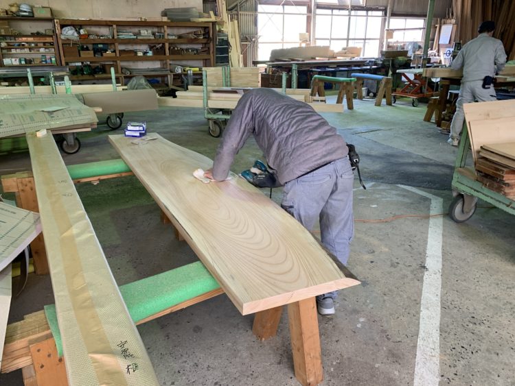 キッチンカウンター桧の一枚板工場加工。 取り付け完成。