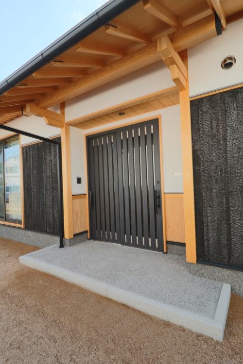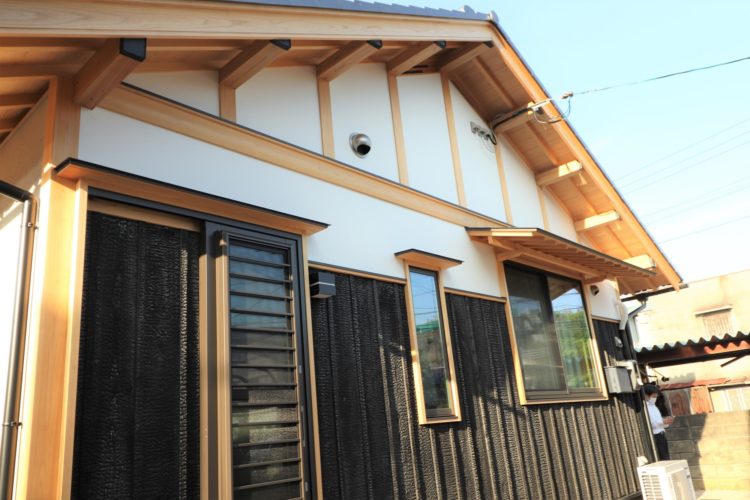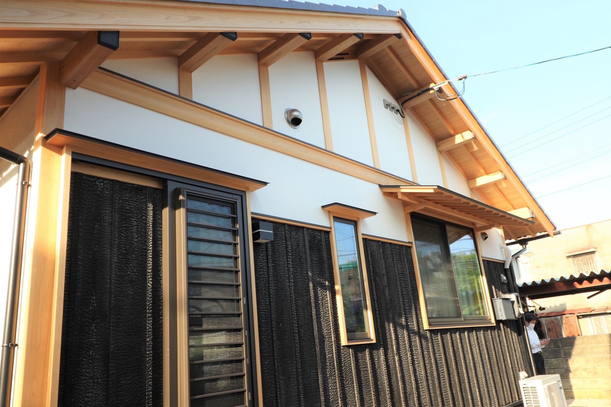 外部仕上げは、焼き板貼り・漆喰塗・化粧腕庇・板庇・化粧梁・化粧束と、お客様こだわりの仕上げです。