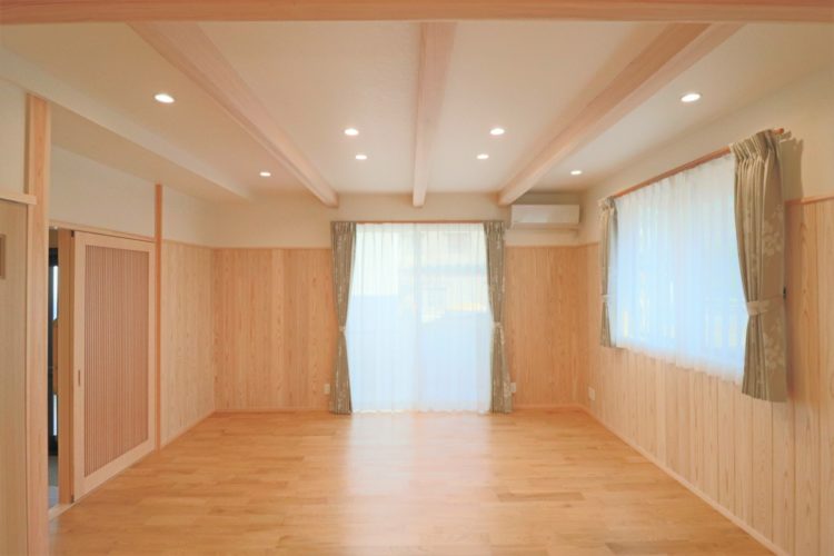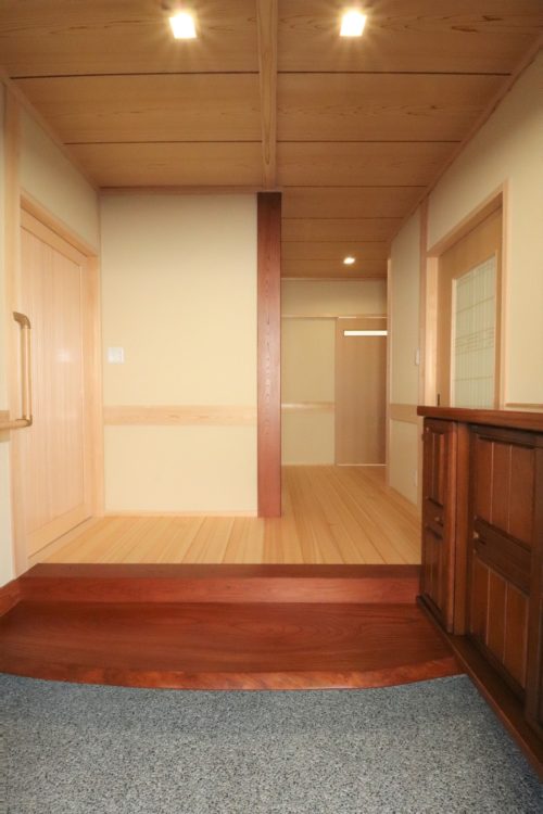 お手持ちだった下駄箱を造り付けにして、大黒柱共、同色仕上げに。