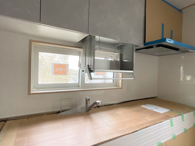 最近は吊戸を付けない方も多いですが、こちらのキッチンには手動で昇降する収納が付いています。