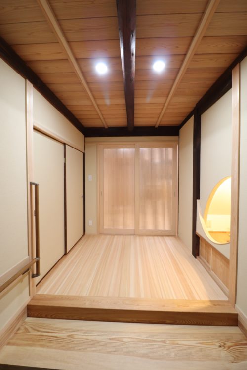 敷居は入れ替え・天井板は貼替・壁は塗替・床組は組替・畳入替にて、再生致しました。