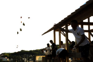 餅まきは、“上棟”(じょうとう)という工程が無事に終わったことを祝い餅をまく行事のことで