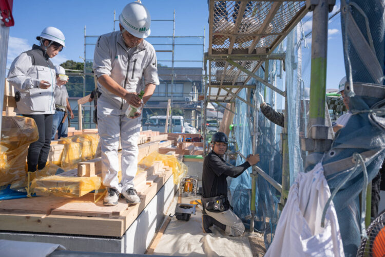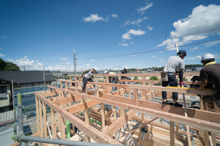 暑い中大工さんや現場監督たちが声を掛け合い、
