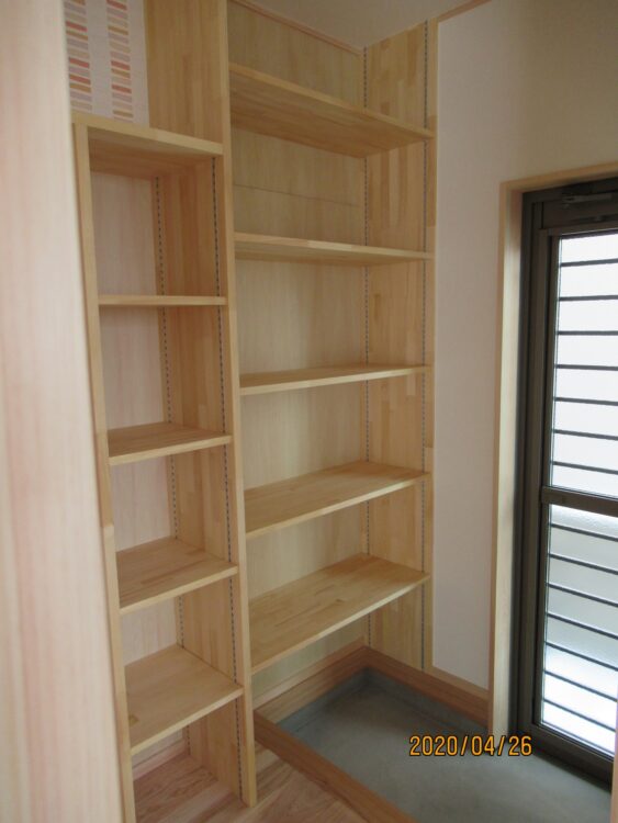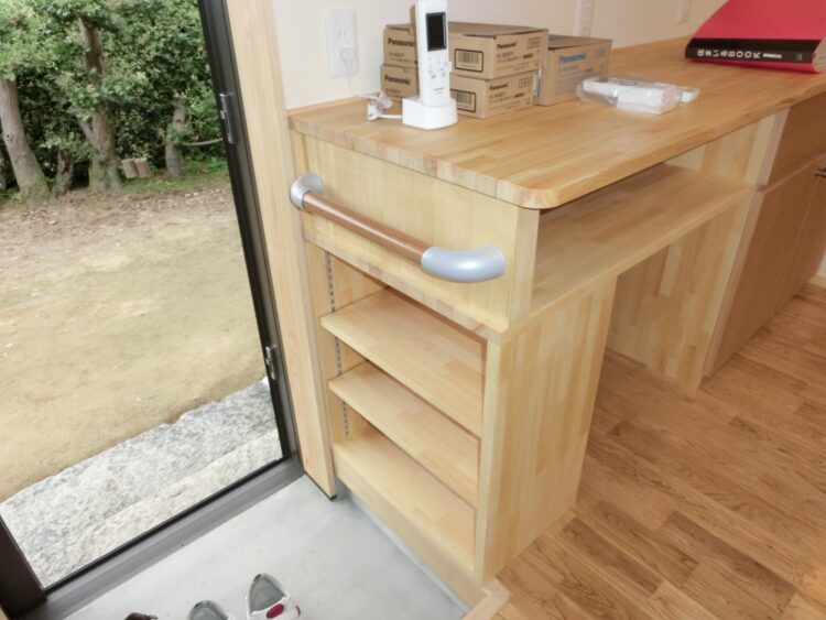 左右のオープン棚の奥行を変えて、買い物帰りにはそのまま・・・。