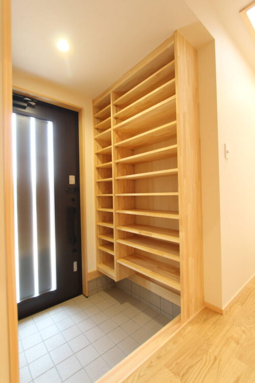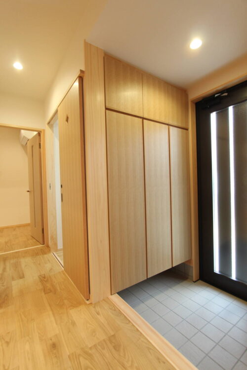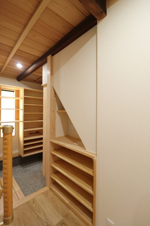 玄関・土間収納側に向かって登る階段下を、玄関側は、地袋収納付飾り棚に。