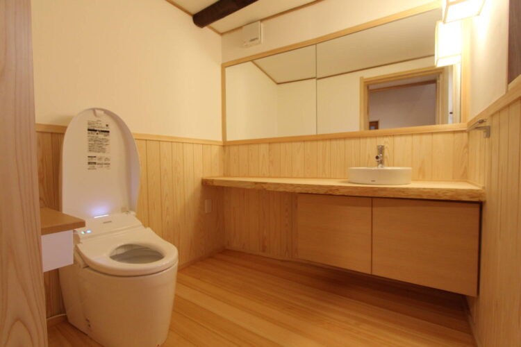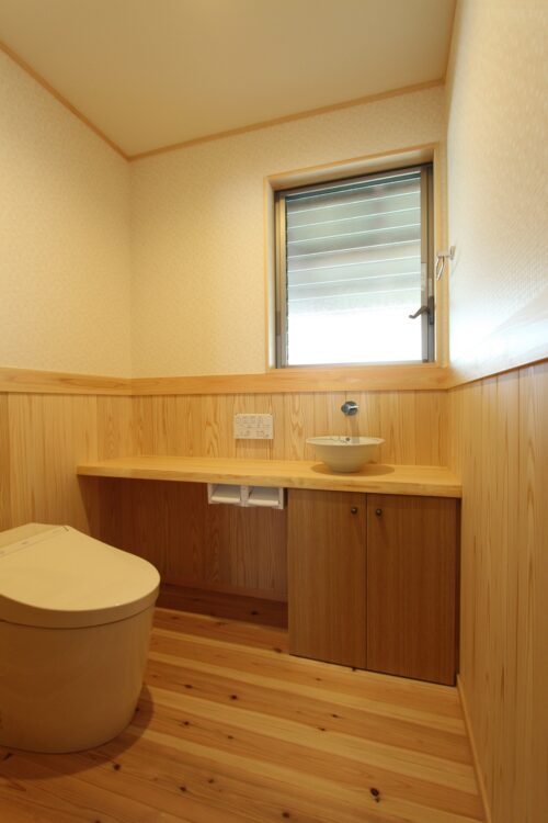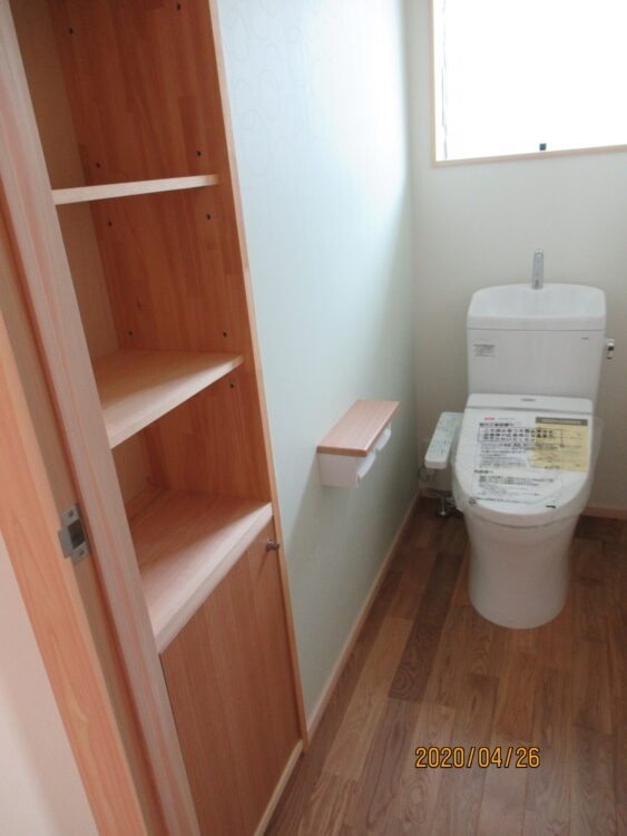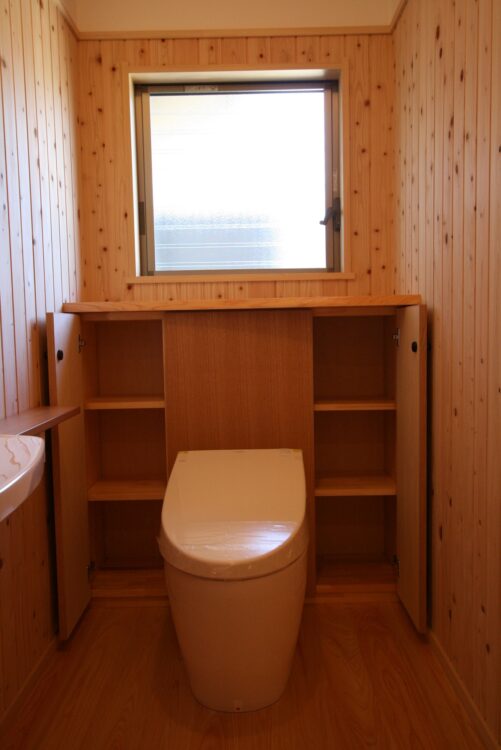 トイレにも工夫と、使い勝手を考えての、色々な収納が造作出来ます。