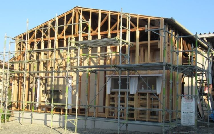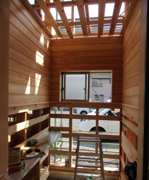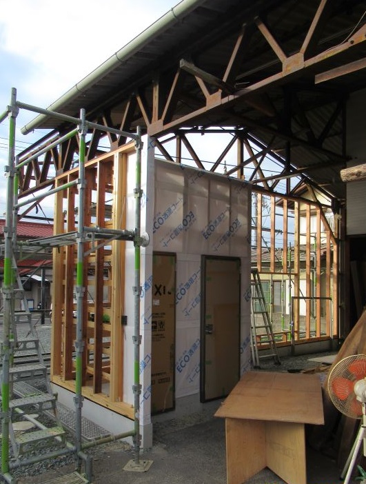 旧事務所の解体に伴って、旧事務所に接していた加工場のトイレと資材置き場の一部も解体されていたのですが、復旧のため基礎がうたれ、数日前から大工さんが入って日に日に形が出来てきました。