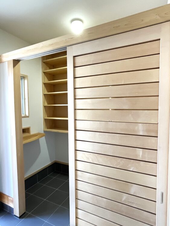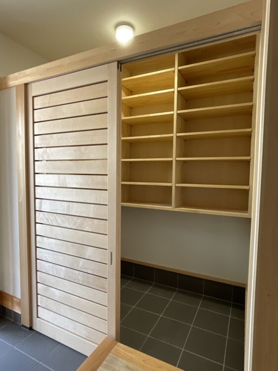 室内の土間収納の中にある郵便受けは無垢の1枚板です。