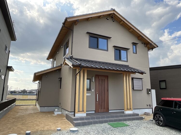 ゆったりとした玄関ポーチに化粧の柱がアクセントになった外観。