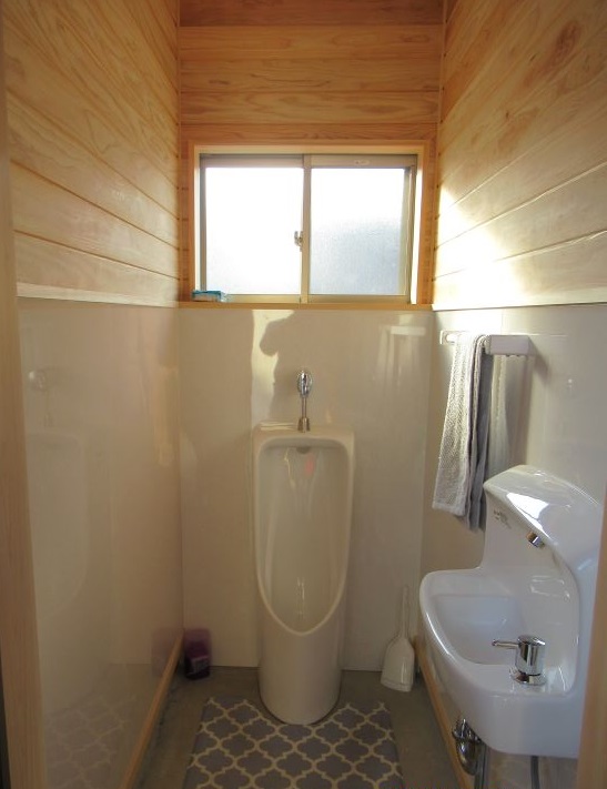 新しくなったトイレの壁には、小便器の方は杉、